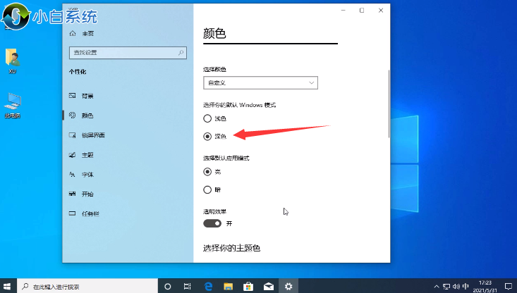 3.然后我們下拉找到“選擇你默認的windows模式”選擇“深色”模式,我們的任務欄主題就變為黑色的了。