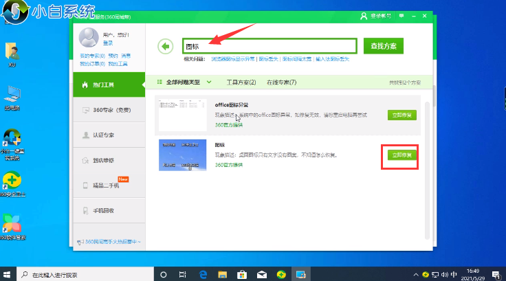 4.進入頁面后,我們在搜索框中輸入”圖標“,點擊下方的”立即修復“。