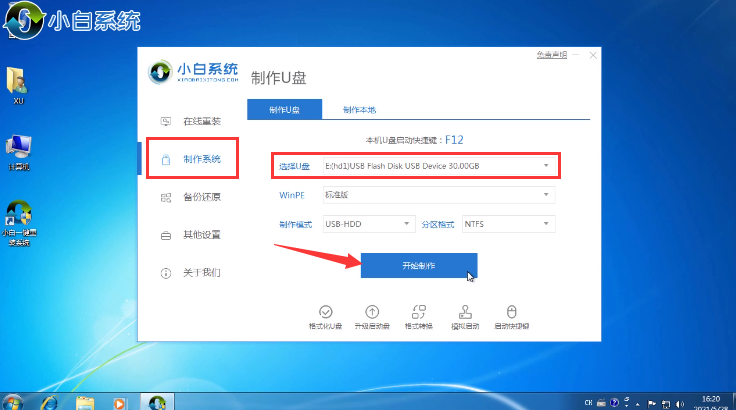 1.首先我們準備一個4G內存以上的空白u盤,插到電腦中,下載一個小白一鍵重裝系統軟件,打開后選擇左側的制作系統,點擊u盤的名稱,選擇“開始制作”。