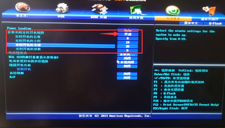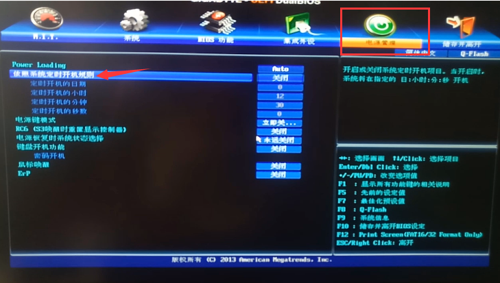 2.按方向鍵向右,轉移到“電源管理”頁面,然后方向鍵向下將“依照系統定時開機規則”選項打開。