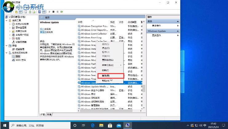 3.在右側打開的服務列表中,找到“windows update"服務,右鍵打開”屬性“。