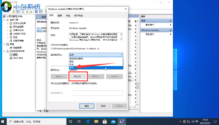 4.在屬性頁面,我們將其啟動類型修改為禁用,然后點擊下方的”停止“。