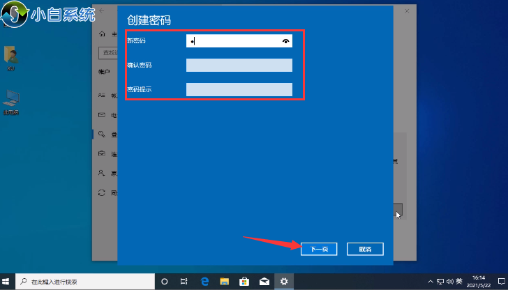 3.在彈出的頁面中,輸入我們創建密碼,然后確認一次新的密碼,最后填寫密碼提示完成后,點擊下方的”下一步“。