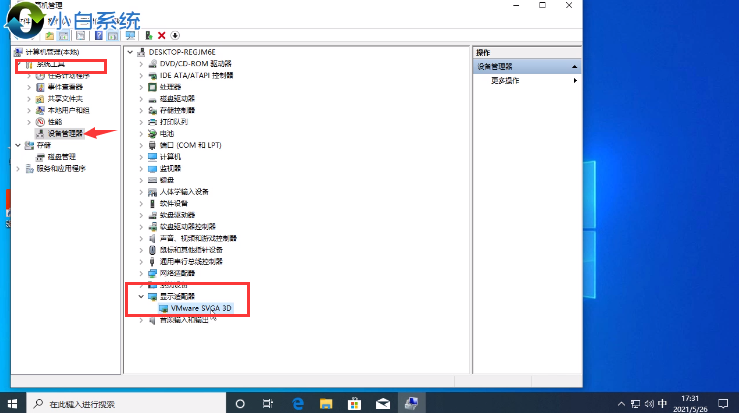 2.在計算機管理頁面,我們點擊系統工具,然后找到設備管理器,在右側點擊顯示適配器,可以看見當前的顯卡驅動型號,當出現感嘆號時,將其重新安裝即可。