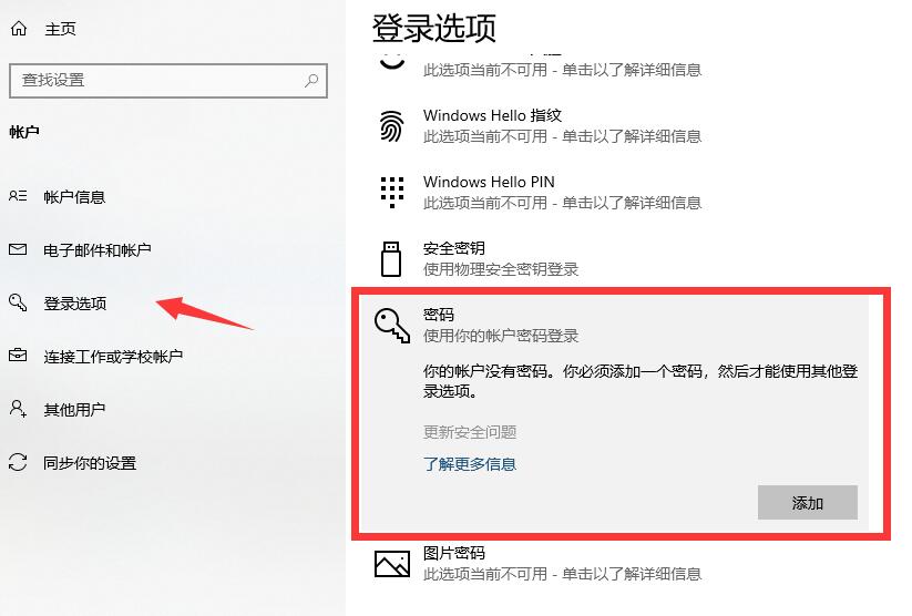 2、在賬戶界面中,找到"登錄選項",點擊密碼,再點擊添加。