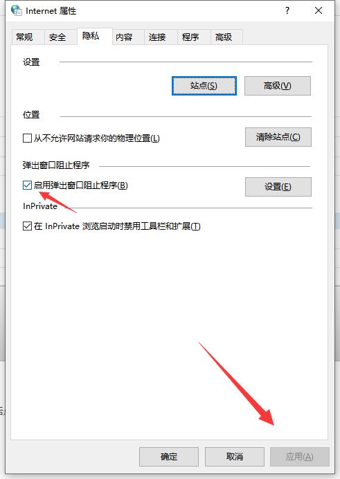3、在打開的窗口中選擇上方的“隱私”然后在隱私下方勾選“啟用彈出窗口程序”在點擊設置進入;