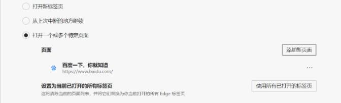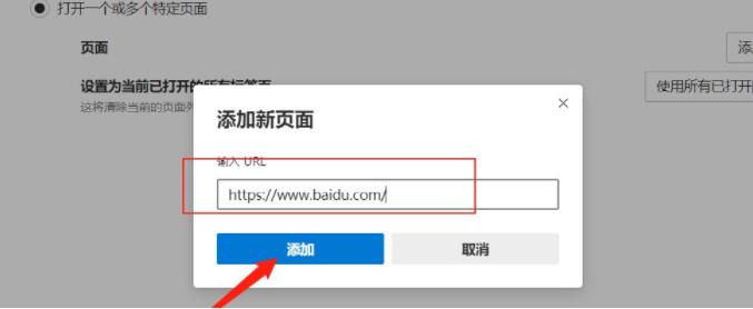 3、選擇“打開一個或多個特定頁”,點擊“添加新頁面”。