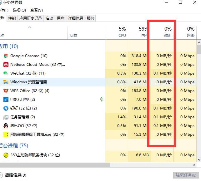 2、在任務管理器中,將磁盤占比較大的任務結束即可。當然也可以優化其他配置來實現。