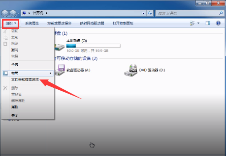 2.進入計算機頁面后我們打開左上角的組織,找到“文件夾和搜索”選項。
