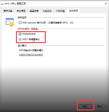 5.進入到高級頁面我們我們找到”wps熱點“及”wps推送廣告“勾選上,并點擊確認。