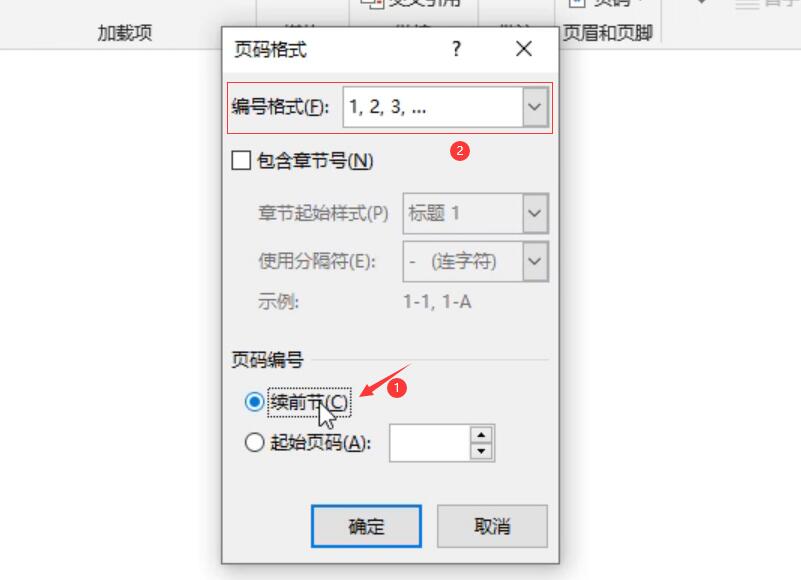 3、在頁碼格式中,選擇頁碼編號,更改為“續前頁”,再設置一個編號格式;