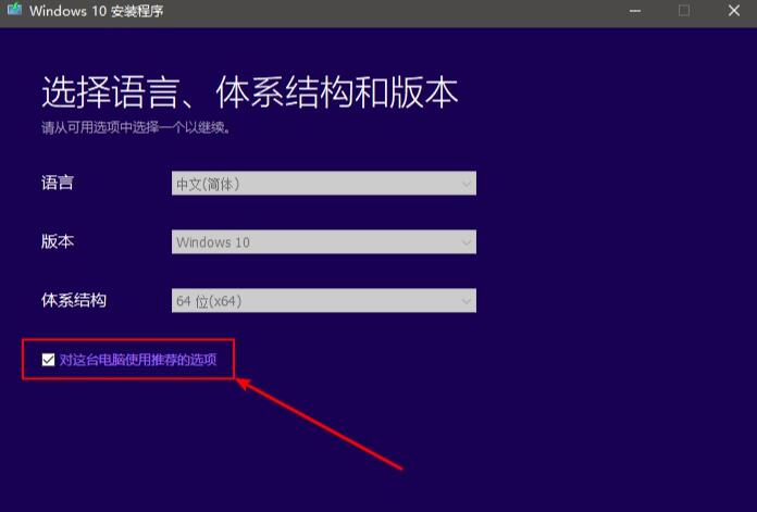 4、一般選擇「Windows10 64位」。如果你制作啟動盤和裝機的是同一臺電腦,直接勾選“對這臺電腦使用推薦的選項”就行。