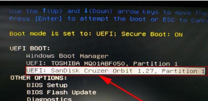 2、我的電腦為戴爾筆記本,開機時按F12,出現下圖所示時,按上下鍵選擇U盤后回車,我的U盤品牌為閃迪,很明顯就能看到下面紅框標記里有「SanDisk」字樣。(各品牌電腦出現的界面略有不同,但大同小異。)