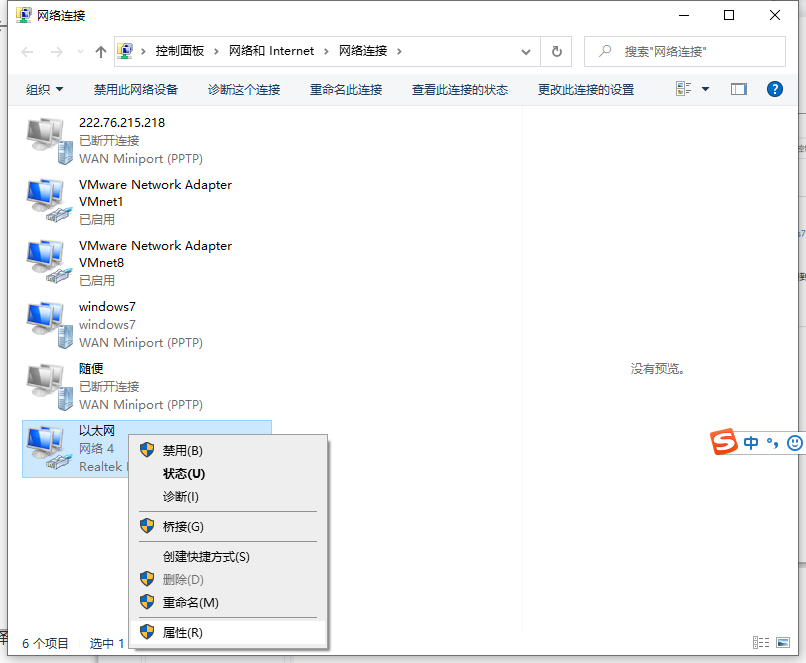 5、在打開的網絡連接窗口,就可以看到電腦中本地連接的列表了,然后右鍵點擊正在使用的本地鏈接,在彈出菜單中選擇“屬性”菜單項。