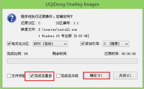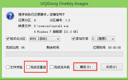 5、程序提醒還原操作的時候,一定不要勾選“完成后重啟”復選框,點擊確定進行還原操作。