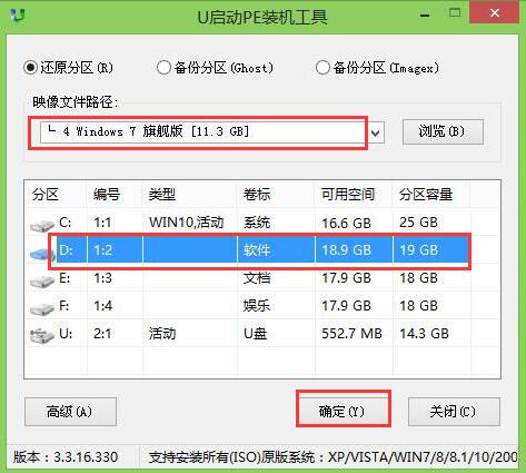 4、接著再進入win8pe系統,打開u啟動pe裝機工具,選擇win7系統鏡像,并安裝在c盤以外的分區。