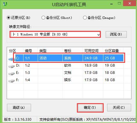 1、u盤插在電腦上并重啟電腦,直接進入win8pe系統。先確定硬盤是否已經分好區,如果還沒分區就用diskgenius分區工具進行分區。接著在u啟動pe裝機工具中選擇win10鏡像,安裝在c盤,點擊確定。