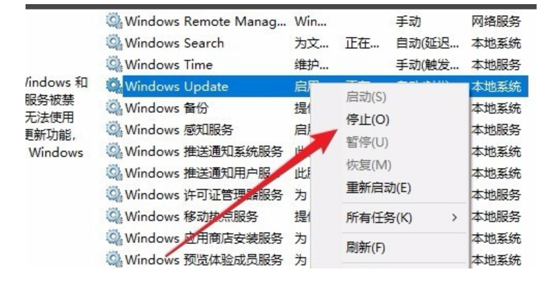 4、這時會打開Windows10服務列表,在列表中找到Windows Update服務項,然后右鍵點擊該服務項,在彈出菜單中選擇“停止”菜單項。