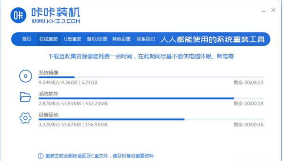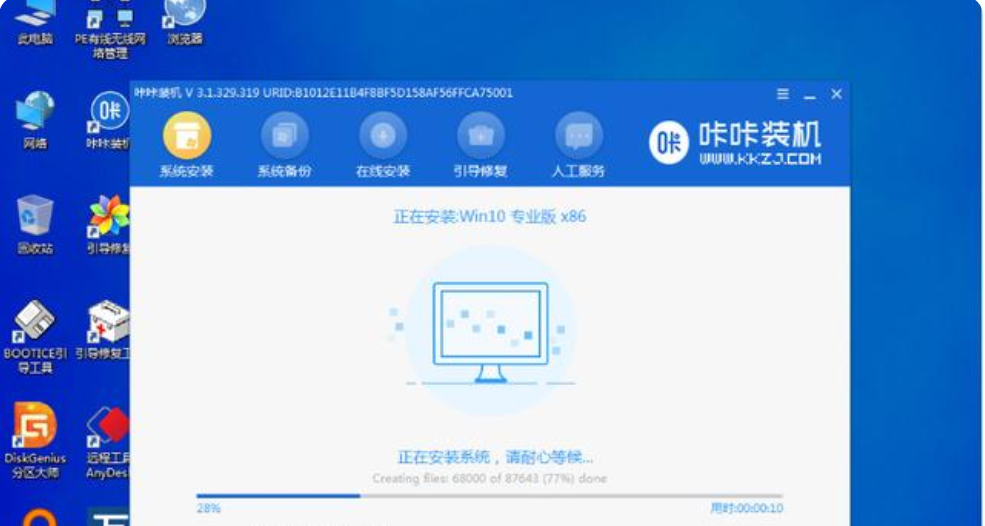 5、進入pe系統后,咔咔裝機工具會自動開啟并安裝win10系統。
