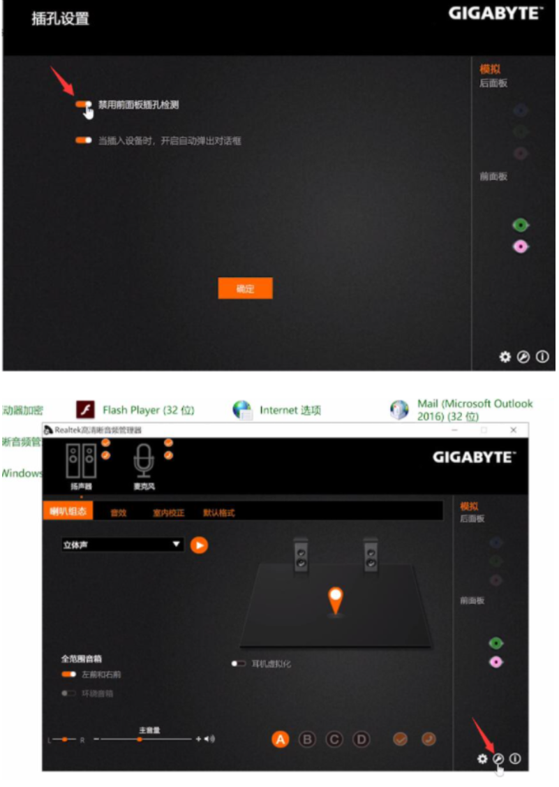 3、單擊右下方的工具圖標,關閉禁用前面板插孔檢測即可。