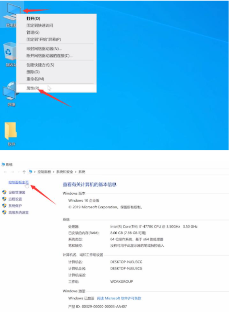 1、鼠標右鍵單擊此電腦,選擇屬性,單擊控制面板主頁;