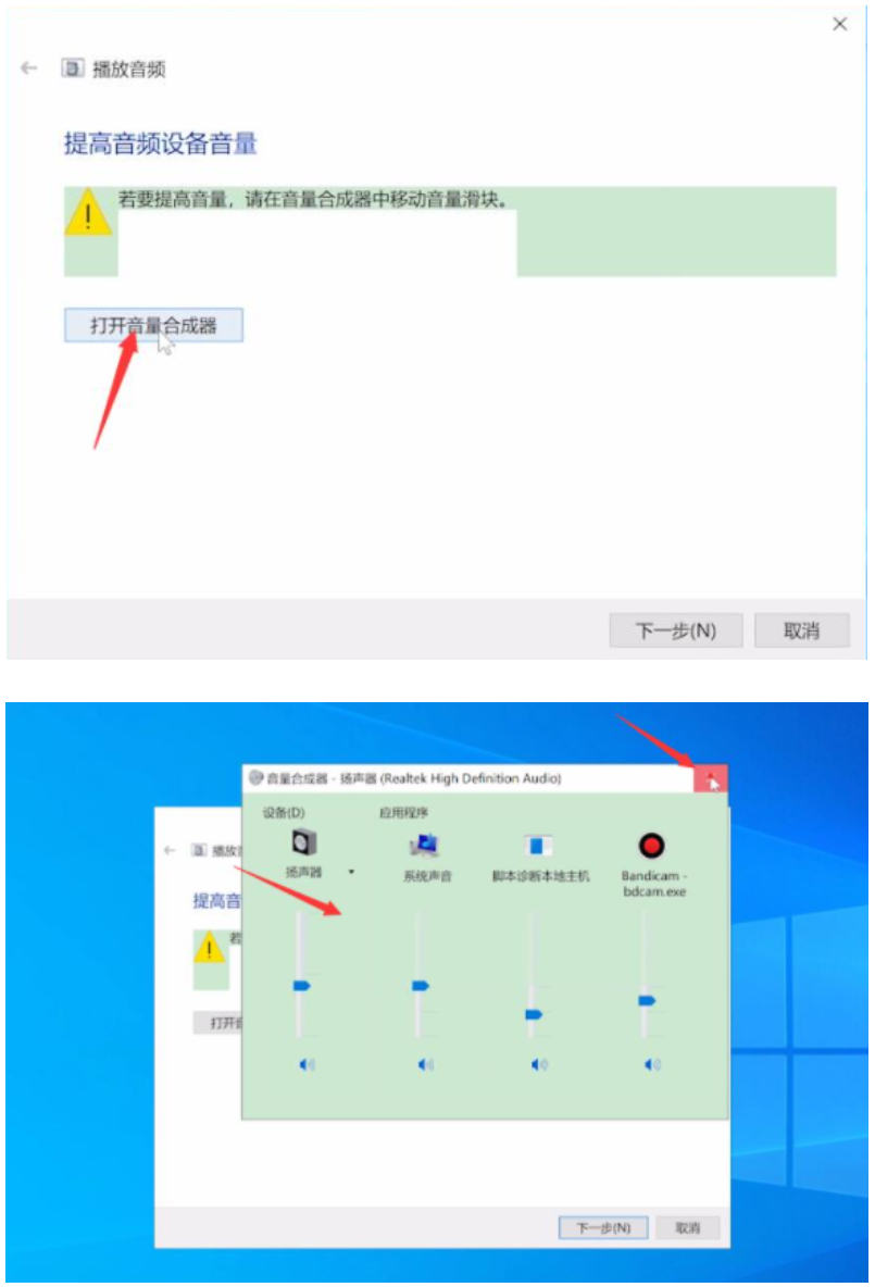 4、打開音量合成器,將各項聲音拉大,退出當前窗口,選擇下一步,關閉;