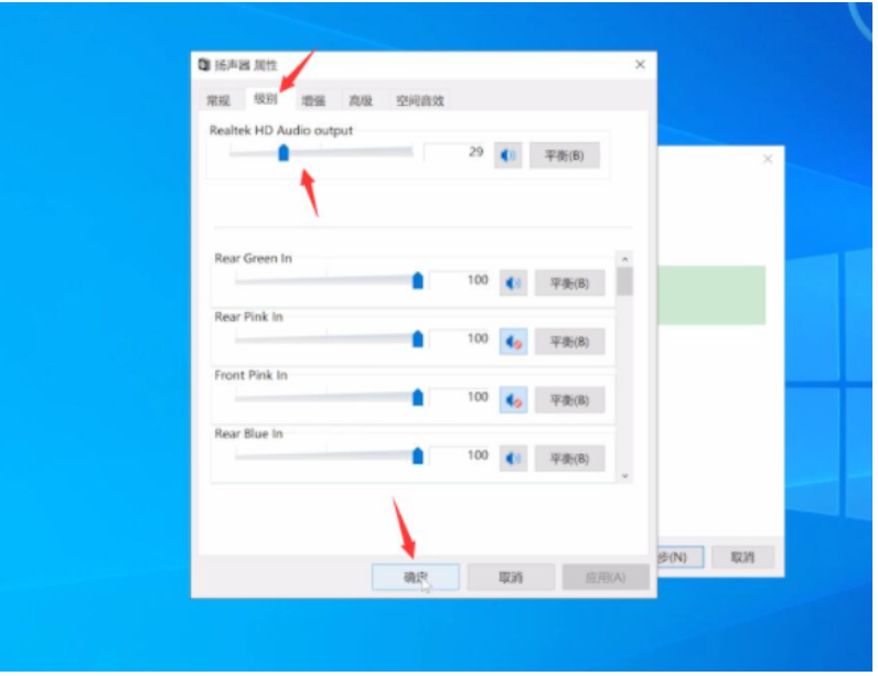 3、彈出窗口,切換到級別選項欄,將聲音調節器拉大,點擊確定。