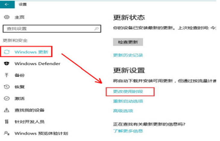 1.點擊開始按鈕,選擇“設置”、“更新和安全”、“Windows更新”、更新設置下面的“更改使用時段”;