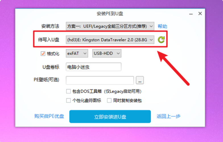 2、在“帶寫入U盤”里選擇U盤,這里建議不要同時插2個U盤在電腦,以免格式化錯誤,導致數據丟失。