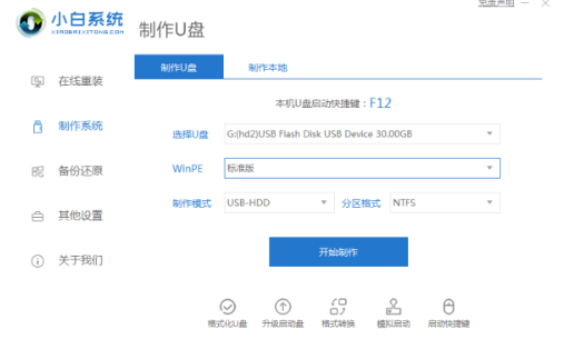 1.打開小白一鍵重裝系統軟件,退出殺毒軟件,等待軟件檢測本地環境完成后進入主界面,然后將U盤插入電腦,點擊制作系統,開始制作u盤啟動盤。