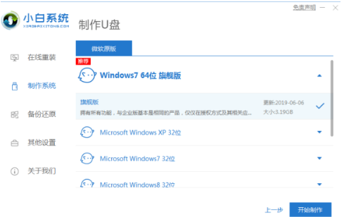 2.然后選擇需要安裝的windows系統,點擊開始制作。這里你可以選xp系統。
