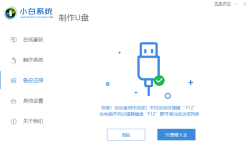 3.之后就等待U盤啟動盤的制作就可以啦,制作完成后點擊快捷鍵,查看需要重裝系統的啟動熱鍵,然后拔出U盤。
