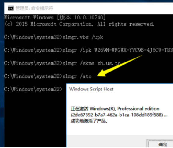 5.最后我們輸入命令:slmgr /ato,回車鍵后將彈出“成功的激活了產品”的提示窗口,就完成激活啦。