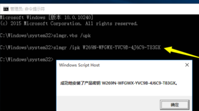 3.接著輸入命令:slmgr /ipk W269N-WFGWX-YVC9B-4J6C9-T83GX(此為版本對應的密鑰,自己查看并按上面對應選擇),接著回車鍵后會彈出“成功的安裝了產品密鑰”的提示。