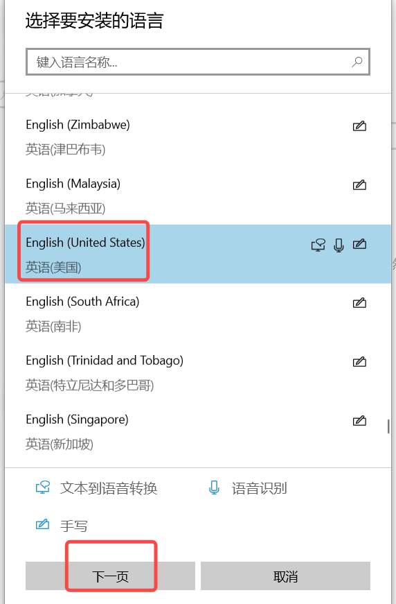 5在彈出界面中用鼠標【滾輪】下滑找到并點擊【英語(美國)】;