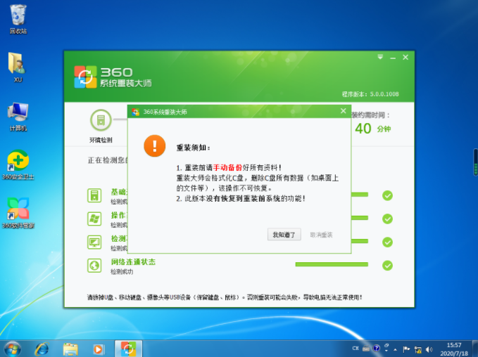 5、需要注意的是,重裝前請注意備份 C 盤以及桌面上重要的資料到其它盤,以免重裝會刪除。