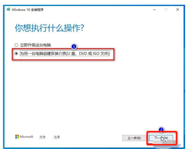2、選擇“為另一臺電腦創建安裝介質(U盤、DVD或者ISO文件)”,點擊“下一步”。