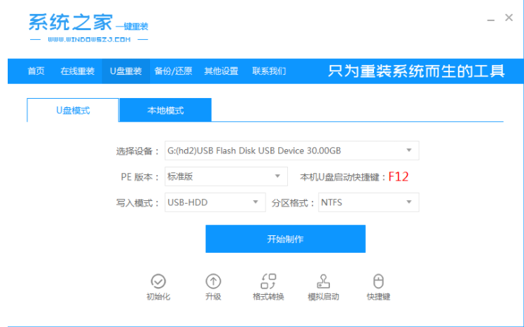 1、筆記本如何重裝系統win10企業版呢?首先在電腦上下載安裝系統之家一鍵重裝系統工具,插入8GB以上的空白u盤,然后選擇u盤重裝功能開始制作啟動u盤。