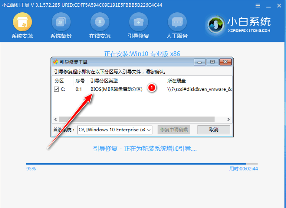 5、系統進入自動安裝程序,耐心等待即可,出現引導修復工具頁面,在C盤前打勾,點擊確定。
