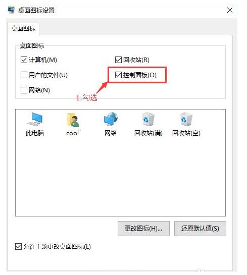 7.在新打開桌面圖標設置中,勾選“控制面板”選項,點擊確定保存,回到桌面即可看見控制面板。