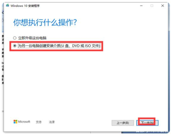 3、然后選擇為另一臺電腦創建安裝介質,點擊下一步。