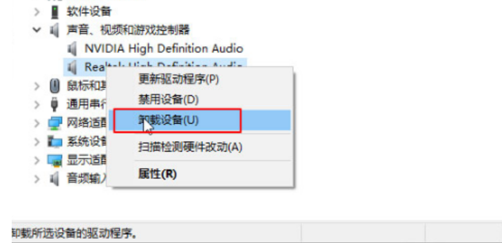 2.我們在設備管理器界面找到聲音、視頻和游戲控制器,選擇顯卡驅動右擊“卸載驅動”。