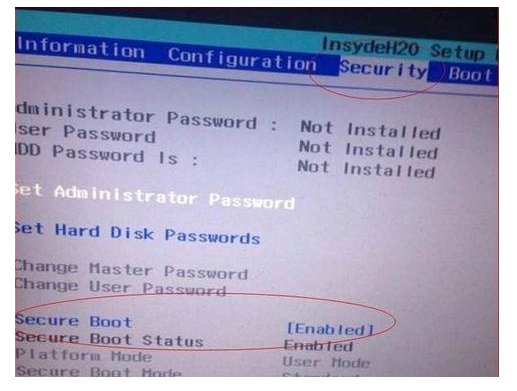 2、找到 Secure Boot 選項,并關閉它。按鍵盤上下左右鍵選擇各個導航夾,一般在“Security”導航夾內可以找到SecureBoot選項,如下圖所示。
