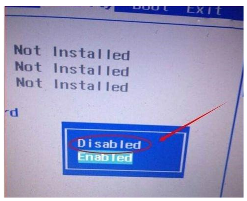 3、后邊的“Enabled”表示SecureBoot是開啟的狀態,我們按鍵盤下鍵跳到這個選項,按回車鍵彈出如下圖。再按鍵盤上下鍵,選中“Disabled”,意思是關閉SecureBoot,選中后按回車鍵,然后按“F10”鍵并按回車鍵確認則保存BIOS配置。