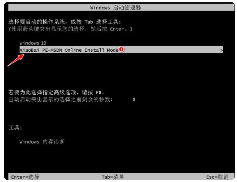 4、重啟計算機系統后,將第二個xiaobaipe-msdnonlineinstallmode選中WindowsPE系統。