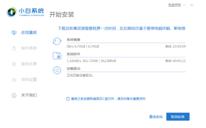 總結:下載小白一鍵重裝軟件,在打開軟件之后選擇我們要安裝的系統。下一步就是要下載系統鏡像。安裝前,點電腦部署環境,部署環境完成后,我們將直接重新啟動電腦。重啟計算機系統后,進入PE系統,之后只要耐心等待,就會自動部署安裝Windows系統。點擊重啟,等待安裝完成。
