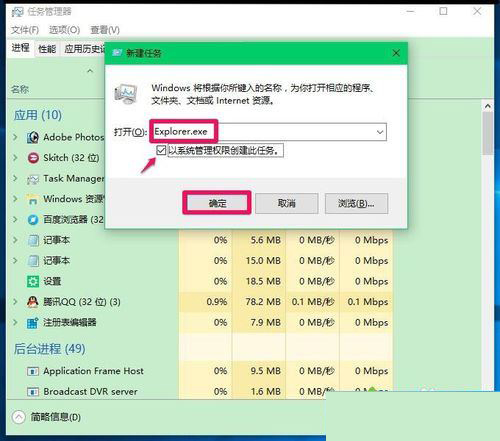 2、在打開的任務管理器窗口,點擊【文件】,在下拉菜單中點擊【運行新任務(N)】,輸入:Explorer.exe,點擊【以系統管理權限創建此任務】打勾,再點擊:確定,此時系統桌面圖標應該已經恢復。