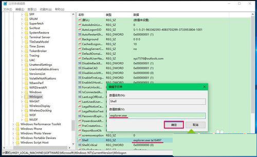 5、在Winlogon對應的右側窗口,找到Shell,左鍵雙擊Shell,如果Shell的數值數據為:explorer.exe,則是正確的,如果不是explorer.exe,則把Shell的數值數據更改為:explorer.exe(如還有其它字符,請刪除),再點擊:確定;