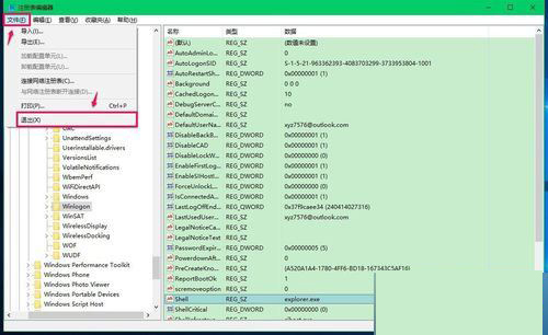 6、點擊注冊表編輯器左上角的【文件】,在下拉菜單中點擊【退出】,退出注冊表編輯器。