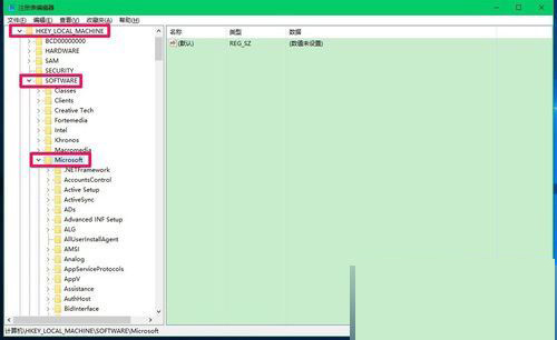 2、在打開的注冊表編輯器窗口,依次展開:HKEY_Local_MACHINE\Software\Microsoft;
